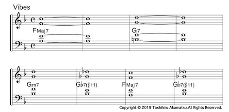 先週までに説明していたヴィブラフォンやマリンバによるコード伴奏(カンピング)の形、というものの組立て方を別の角度で考えてみましょう。